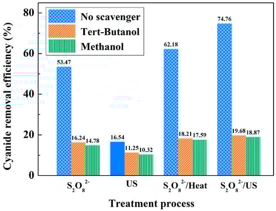 Tert-butanol and methanol are two common free radical scavengers. Studies have shown that the reaction rates of and with tert-butanol are 4.0 × 105 M−1·s−1 and 1.1 × 107 M−1·s−1, respectively, while the reaction rates of and with methanol are 3.2 × 106 M−1·s−1 and 9.7 × 108 M−1·s−1, respectively [26]. Therefore, tert-butanol is mainly a scavenger of radicals, while methanol can be a scavenger of both and radicals. In this section, the cyanide removal efficiencies of different treatment processes (Table 3) with and without free radical scavengers are shown in Figure 8. The amount of tert-butanol and methanol added was 2.0 wt.%. The cyanide removal efficiency decreased with the addition of both tert-butanol and methanol when S2O82− existed in the systems, showing that both and were generated during the S2O82− process. The results show little difference between the treatments with the two kinds of radical scavengers added, indicating that played a major role in cyanide removal. It could be inferred that more free radicals were generated through ultrasonic activation due to the higher reduction in the cyanide removal efficiency with radical scavengers. It is worth noting that when S2O82− did not exist in the systems, only 16.54% of cyanides in the residue were removed through ultrasonic treatment. There might be two reasons for this: that (1) some of the cyanides in the residue were removed into the filtrate through ultrasonic shaking and (2) radical was generated in aqueous solution by ultrasound and then oxidized cyanide [39]. The study of Wei et al. [40] found that the amount of generated was about twice as much as in the ultrasonic-activated persulfate process because cavitation bubbles enhanced the reactions between sulfate radicals and water molecules.