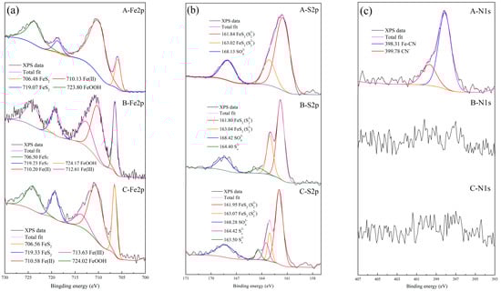 To determine the change in the main species during the cyanide removal process, the XPS spectra (survey, Fe 2p, S 2p and N 1s) of cyanide residue before and after cyanide removal treatment are shown in Figure 9 and Figure 10 and Table 4. Sample A is the original cyanide residue before cyanide removal treatment, and Samples B and C are residues after treatment through the heat-activated and ultrasonic-activated persulfate process, respectively. The results show that the content of C on the surface of the cyanide residue before treatment was 23.13% and, respectively, decreased to 19.36% and 16.68% in Sample B and Sample C. The N element was only detected on the surface of the original cyanide residue. The change in elements C and N content showed that the cyanide adsorbed on the surface of the cyanide residue was effectively removed through the persulfate-advanced oxidation process.