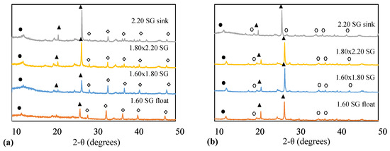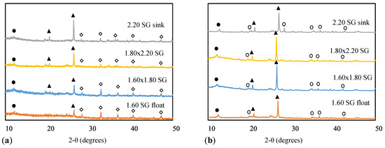 Proximate analysis (moisture, carbon and ash contents) was performed on the time-based LTP-treated products of all the density fractions of Baker seam and Fire Clay (Figure 3). As shown in Figure 3a, the carbon contents of the lower density fractions (1.60 SG float and 1.60 × 1.80 SG) were decreased by plasma treatment, which corresponded to an elevation in the ash contents. Similarly, a significant increase in the ash content was seen for the 1.60 SG float fraction of the Fire Clay source (Figure 3b). However, for the high-density fractions (1.80 × 2.20 SG. and 2.20 SG. sink), the carbon and ash contents changed by a very small amount even after 32 h of LTP treatment. The degree of plasma treatment seems to be directly related to the amount of carbon matter present in the sample. XRD analysis of the LTP-treated Baker seam and Fire Clay samples (Figure 4) did not show a change in mineral composition as compared to the feed material (Figure 1). The peak intensities of individual minerals were increased due to the partial removal of carbon matter from lower density fractions. This finding confirmed that the treatment preserved the crystal structure of the associated mineral matter existing in each density fraction of both coal seam sources.