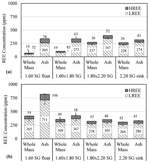 The results from the REE analyses for the two feed sources revealed that both samples contained higher concentrations of LREEs than HREEs (Figure 2). The REE distribution by SG for the two samples showed the potential of enrichment by a simple ashing process. Heavier density fractions in the Baker seam source were found to have higher REE content than the low ash material on a whole mass basis. Ashing the lighter density fraction samples (1.60 SG float and 1.60 × 1.80 SG) at 750 °C for 3 h enriched the REEs in the residual ash by about 200%. The lightest density fraction (1.60 SG float) of the Fire Clay source material had a total REE concentration of more than 400 ppm on a whole mass basis while the ash material generated from the same density fraction contained 817 ppm of total REEs. The ash contents of the Fire Clay material (except for 1.60 SG float) were significantly higher than the Baker seam fractions (Table 1), which explains the relatively lower improvement in the REE content through ashing (Figure 2a,b). The relatively high REE contents in the Fire Clay SG fractions correlate well with the findings of numerous studies that identified the middling fractions of the Fire Clay seam to be rich in REEs [31]. The REEs in the middling of Fire Clay coal have been reported to be associated with the mineral matter and exist as finely dispersed monazite, xenotime, zircon and crandallite group minerals with a lower degree of crystallinity [10,11,31,32]. This would necessitate the use of roasting and possibly the assistance of chemical additives to extract the REEs associated with coal deposits [22].