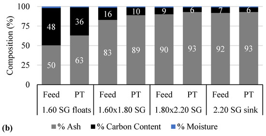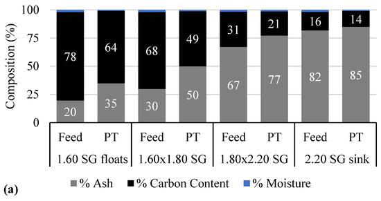 Moisture, carbon, and ash contents of the (a) Baker seam and (b) Fire Clay density fractions after 32 h of LTP treatment. (PT = Plasma Treated).