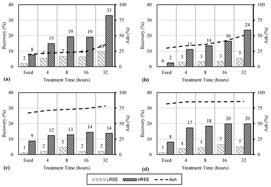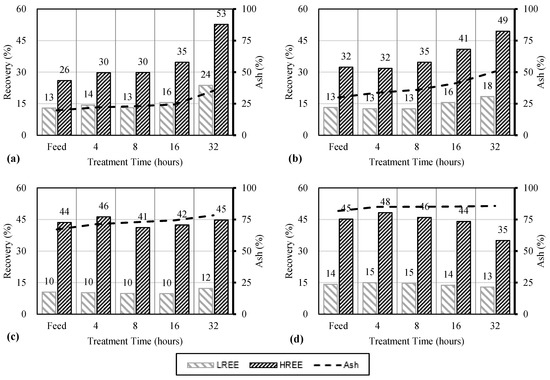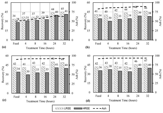 Acid leaching tests with 1.2 mol/L of sulfuric acid at 75 °C were also conducted on the LTP-treated density fractions of the Fire Clay seam. As previously reported in Figure 3b, the ash contents of the plasma-treated products of Fire Clay were marginally increased, indicating limited oxidization of the organic matter. For the 2.20 SG sink fraction, the recovery of both LREEs and HREEs was not affected even after a prolonged treatment time (Figure 7d). For the 1.60 SG float fraction, which contained a relatively higher amount of clean coal, total REE recovery increased by 11% points after low-temperature treatment for 32 h (Figure 7a). However, due to the marginal effect, it can be deduced that more than 32 h of treatment for the low-density fraction is required to obtain a significant impact on REE recovery values. Additionally, the effect on the 1.60 × 1.80 SG and the 1.80 × 2.20 SG density fractions was minimal (Figure 7b,c). Overall, no selectivity was observed for HREEs in the LTP-treated Fire Clay material as it was observed for the Baker material. Findings from the Baker seam indicated that low-temperature treatment is more beneficial to HREEs as they have a higher affinity to the organic matter in coal relative to LREEs. However, such a relationship of HREEs with clean coal was not observed for the Fire Clay source.