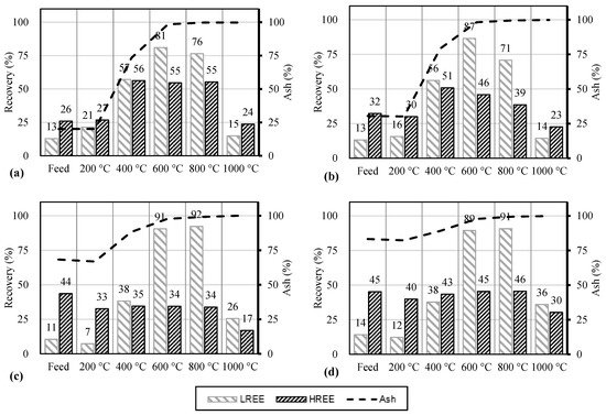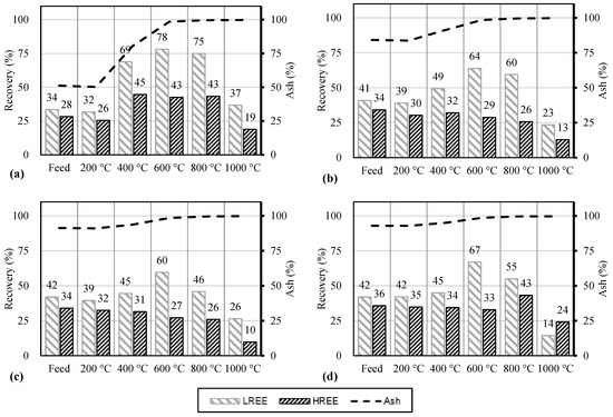 The HREE recovery trend for the 1.6 SG float density fraction revealed that HREEs are liberated by the effect of high-temperature calcination. About 55% of the total HREEs dissolve into the leachate solution. However, the data suggests that HREEs in the heavier density fractions have a very different mode of occurrence where high-temperature calcination provided no significant effect on their recovery. This finding implies that a significant portion of the HREEs exists in an insoluble form, bound with the inert ash material, which is very hard to leach. In order to realize high HREE recoveries, thermal treatment in the presence of chemicals is essential [22]. LREEs show consistency in the mode of occurrence across all density fractions and show very high recovery with values as high as 85%. High HREE recoveries found in the lower density fractions correspond to their association with the clean coal and middling fractions of the Baker seam material. Similar findings have been previously reported for the LTP studies (Figure 6a,b). Total REE recoveries greater than 75% were observed after pretreatment using a temperature of 600 °C. It was also observed that even partial carbon removal at 400 °C released the HREEs bound with the organic matter and resulted in higher REE recoveries.