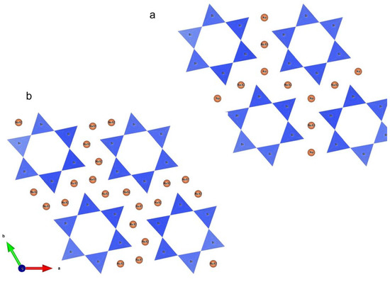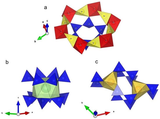 To simplify the chemical content at the A site exclusively with Fe3+ while having the maximal Na content at the B site, a sugilite analogue, Fe3+Na2K[Li3Si12O30], was synthesized under mild hydrothermal conditions [11]. In this previous study, we detected diffuse density distribution of neutron scattering lengths (nsl) of Li and Na from difference Fourier (ΔF) maps evaluated with high-resolution neutron powder diffraction (HRNPD) data from 298 to 1123 K. This observation pointed to a high dynamic disorder of Li and Na in Fe3+Na2K[Li3Si12O30] and their 2D hopping paths, which were strongly anisotropic parallel to the (a–b) plane. In the sugilite structure, there were several interstitials around 12-membered rings (MRs) of LiO4–FeO6 polyhedra (Figure 2a), other spacious interstitial sites around K at the C site (Figure 2b), and empty 6MRs in the middle of two neighboring B sites (Figure 2c). Using HRNPD, we could resolve only two interstitial sites: one Li interstitial site possibly at (0.3333, 0, 0.25) around 12MRs of LiO4–FeO6 and another one for the Na interstitial at (0.5, 0.5, 0) between neighboring B sites.