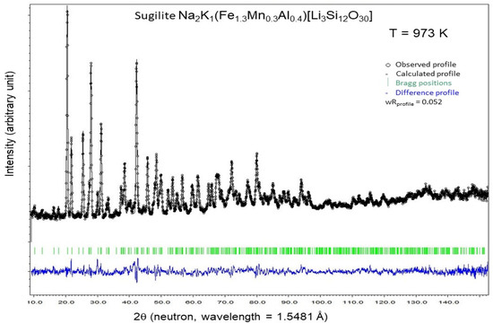 The aim of Rietveld analysis with 973 K HRNPD data was to check the pure phase along with the thermal stability of the sample Sugilite#2, on which IS were probed up to 1064 K. HRNPD data analysis confirmed the sugilite compound (Fe1.3Mn0.3Al0.4)Na2K[Li3Si12O30] as the single phase in Sugilite#2, graphically presented in Figure 3 with a good agreement factor, wRprofile = 0.052. Lattice parameters of Sugilite#2 were a = 10.0794(7) Å and c = 14.1057(19) Å at 973 K. Refined atomic parameters are listed in Supplementary S1.