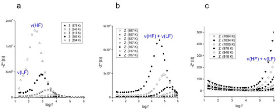 Plots of imaginary parts Z’’ of impedance against the logarithmic scale of AC frequency f, probed on Sugilite#2 ((Fe1.3Mn0.3Al0.4)Na2K[Li3Si12O30]). ν(HF) and ν(LF) peaks shifted towards higher frequencies at elevated temperatures and, hence, were assigned to thermally activated motions in the bulk sample. (a) In the low-temperature range, ν(HF) and ν(LF) were well resolved; (b) ν(LF) moved fast into the regime of ν(HF) above 700 K; (c) both resonances started to move out of the measuring frequency range above 900 K.
