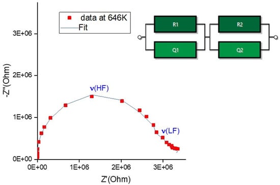 As shown in Supplementary S2a,b, IS from 615 K up to 827 K could be fitted to two serially connected RC circuits where R represents resistance of the mobile species, and Q is the frequency-independent constant phase element. The latter derives from a capacitor with phase angle shift in the impedance complex planes with depressed semicircles [35]. The HF mode is associated with the bulk conductivity [11]. The LF mode is probably related to the grain boundary resistance with a discrete nature in our compact sample Sugilite#2. The subscript ‘1’ of R1 and Q1 represents the ν(HF) mode of the bulk intragrain conductivity, while the subscript ‘2’ of R2 and Q2 is the ν(LF) mode assigned to the charge transport in grain boundaries. As an example, Figure 5 presents results from fitting the IS of Sugilite#2 ((Fe1.3Mn0.3Al0.4)Na2K[Li3Si12O30]) at 646 K.