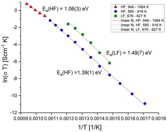 Arrhenius plots with DC conductivity values from fitted HF and LF semicircles allowed the delivery of the respective activation energies (Ea), as shown in Figure 6: Ea(HF) = 1.39(1) eV in 585–916 K and Ea(LF) = 1.49(7) eV in 676–827 K. The former was associated with the energy barrier for intrinsic ionic motions in Sugilite#2, and the latter with extrinsic charge transport over grain boundaries. An ionic conductivity value of 2.04 × 10−3 Scm−1 was estimated at 1064 K with Ea(HF) = 1.06(3) eV for the bulk ionic conductivity in the high-temperature range of 946–1064 K.