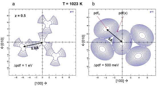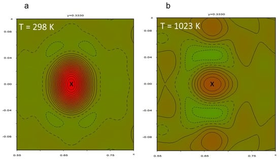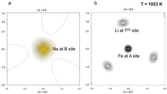 The probability density function (PDF) corresponds to the distribution of the space- and time-averaged atomic density as the Fourier-transformed Debye–Waller factor (DWF) including anharmonic terms ([41,42,43,44,45], literature therein). The possible migration pathways of mobile species can be expressed by the so-called one-particle potential (OPP) V(x), which is related to the PDF by Boltzmann statistics V(x) = −kB T ln[PDF(x)/PDF(xo)], where kB T >> V(x); x is the displacement vector; xo is the equilibrium position; kB is the Boltzmann constant; and T is the absolute temperature. Non-zero anharmonic ADP terms of Li and Na for the distortion of simple Gaussian distributions were included in their DWFs via Gram–Charlier expansion [41,45] using XSD data at 1023 K to describe their complex migration pathways. The joint probability density function (jPDF) was obtained from a superposition of individual atomic PDFs in a Cartesian system, leading to a continuous distribution of density between adjacent sites [46]. In Figure 9a, a jPDF is drawn with the second, third, and fourth anharmonic ADP terms of Na, exhibiting a migration direction towards interstitials located between two neighboring B sites. In Figure 9b, a jPDF is evaluated with the second and third ADPs of Li, and the harmonic terms of Fe (i.e., its second anharmonic ADPs) resolves Li hopping over interstitials between T(II) sites. This jPDF does not show site-exchanging Li between T(II) and A sites.