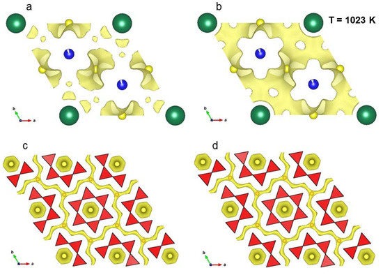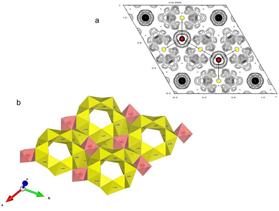 Careful inspection of difference Fourier (ΔF) maps obtained from XSD data at 1023 K allowed us to find electron density residuals at two interstitial sites: LiX1 at (0.3397, 0, 0.25) and LiX2 at (0.7230, 0.8630, 0.25). These are four-fold coordinated with framework oxygens and were suitable for residing Li (Figure 11a). Highly distorted tetrahedral LiO4 (i.e., Li at T(II)), LiX1O4, and LiX2O4 moieties were connected by common edges and faces to form a densely connected 2D network parallel to the (a–b) plane, as illustrated in Figure 11b. Accordingly, small interatomic distances (d) were present in this 2D network as possible paths for hopping Li+ over d(Li–LiX1) = 1.6147(4) Å and d(LiX1–LiX2) = 1.7818(1)~1.8106(4) Å. These are much shorter than 5.0 Å based on the OPP V(x) model.