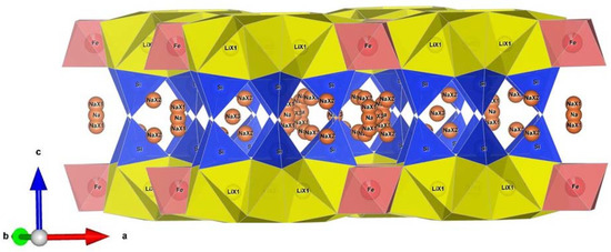 Among Li-bearing milarite-type compounds [10,11,17,18,19,20,21,22], sogdianite contains Zr4+ as the main element at the octahedral A site but is mostly empty at the B site (6+3)-coordinated with framework oxygens, while sugilite is Fe3+-rich at the A site (Figure 1a), and Na fully occupies the B site (Figure 1b). A DC conductivity value of 1.7 × 10−3 S·cm−1 of sugilite at T = 943 K, which was estimated from a frequency-independent part on Bode plots of impedance spectra (IS) ([23] and this study), is two orders of magnitude higher than that of sogdianite [10]. Hence, the ionic conductivity in this topology can be dictated by the amount of Na at the B site for the same amount of Li at the T(II) site. Na cations compensate electrostatically the negative-charged framework unit [Fe2Li3Si12O30]3− but also may play a critical role for the charge transport in sugilite.