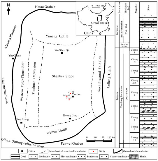 The Ordos Basin, with an area of 3.7 × 105 km2, is the second largest basin in China [20]. The basin is bounded by the Hetao Graben, the Alashan Platform, the Liupanshan Basin, the Fenwei Graben, the Qilian-Qinling collision zone, and the Luliang Uplift (Figure 1) [20,21]. The Ordos Basin contains six tectonic units, including the Yimeng Uplift, the Shanbei Slope, the Weibei Uplift, the Tianhuan Depression, the Western Fold-Thrust Belt, and the Jinxi Flexural Fold Belt.