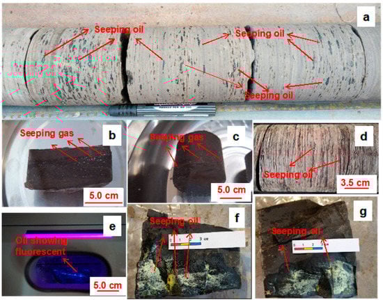 Photos showing the coexistence of oil, gas and water in the Chang 7 Member shale. (a) Oil and gas are seeping from the sandy laminated shale, well Q1240, 1671.47–1671.82 m, core photo; (b) Gas is seeping from the shale when submerged in water, well W1447, 1954.68 m, core photo; (c) Gas is seeping from the shale when submerged in water, well D1325, 1172.72 m, core photo; (d) Oil and gas are seeping from the shale, well D214, 1170.46 m, core photos; (e) Oil and gas in the shale are showing fluorescence, well D1339, 1152.37 m, core photo; (f) Oil and gas in the shale are seeping from fractures, well W1447, 1954.47 m, core photo; (g) Oil and gas in the shale are seeping from fractures, well W1447, 1955.11 m, core photo.