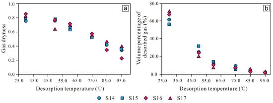 At desorption temperatures of 30 °C, 50 °C, 60 °C, 75 °C, 85 °C and 95 °C, the volume of desorbed gas decreased as the desorption time increased. For example, during desorption at 30 °C, the volume of desorbed gas in the first 12 h was much larger than that the volume in the second 12 h (Table 3). The total volume of gas desorbed in the second 12 h was only 10% of that desorbed in the first 12 h for sample S17 (Table 3). From this, it can be inferred that gas desorption becomes more difficult over time at a given desorption temperature. However, the volume of desorbed gas increases if desorption temperature is increased. Taking sample S13 as an example, the volume of desorbed gas in the second 12 h was only 0.063 L (at the desorption temperature of 30 °C), while the volume of desorbed gas reached 0.167 L when the temperature was raised to 50 °C. During the latter stage of desorption, only a small quantity of gas can be desorbed out of the samples (Figure 3b). Taking sample S13 as an example, the volume of desorbed gas was only 0.011 L when the temperature was raised to 95 °C.