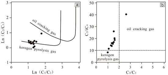 Using C2/C3 and C2/iC4 parameters, scholars established another identification chart to distinguish kerogen pyrolysis gas from oil cracking gas. For the kerogen pyrolysis gas, the value of C2/C3 is less than 2 and the value of C2/iC4 is less than 10; the corresponding vitrinite reflectance is less than 1.5%. For the oil cracking gas, the value of C2/C3 is larger than 2 and the value of C2/iC4 is larger than 10; the corresponding vitrinite reflectance is larger than 2.0% [29]. All the samples in the study area have C2/C3 values less than 2, and most of the samples have C2/iC4 values larger than 10, indicating a complex process of gas loss (Figure 4b).