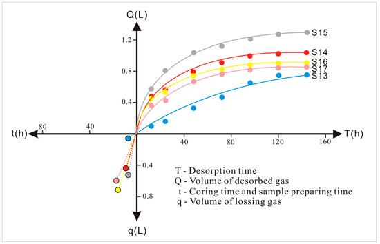 The Chang 7 Member shale in the study area is characterized by high abundance of organic matter and strong gas adsorption capacity; in addition, the shale gas hosted in Chang 7 Member shale is primarily in the adsorbed state [11,12,13]. Thus, the USBM method was selected to estimate the content of lost shale gas. The procedure for calculating lost shale gas is as follows: (1) establish the horizontal coordinates using coring and sampling time as well as desorption time; (2) establish the vertical coordinates using volume of desorbed gas and volume of lost gas; (3) draw the coring and sampling times; (4) draw the desorption times; (5) fit the curves using coring and sampling times and desorption times; (6) determine the straight line for the former desorption period on the coordinate diagram; (7) extend the straight line to the lower-left coordinates; (8) determine the volumes of lost gas using coordinates corresponding to coring and sampling times [31].