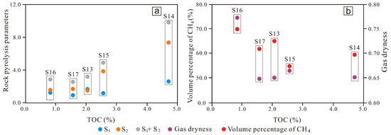 Scatter plot showing the gas generating abilities of studied samples. (a) Relationship between TOC and rock pyrolysis parameters; (b) Relationship between TOC and gas dryness as well as volume percentage of CH4.