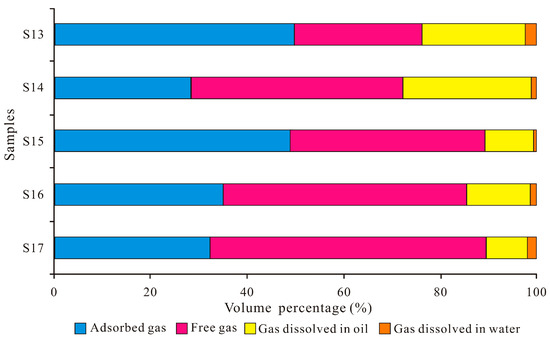 As previously discussed, some shale gas is lost during drilling and sampling. Thus, there is a hypothesis that the three states of shale gas are lost equally during drilling and sampling when using the method mentioned in this study. The calculation results of five samples show that the hosting states of shale gas in the study area are primarily the adsorbed state and free state. The content of adsorbed gas ranges from 0.31 m3/t to 0.64 m3/t, with an average value of 0.43 m3/t; the content of dissolved gas ranges from 0.12 m3/t to 0.31 m3/t, with an average value of 0.19 m3/t; the content of free gas ranges from 0.23 m3/t to 0.63 m3/t, with an average value of 0.48 m3/t (Figure 7). The average volume percentage of free gas is 37.6%, the average volume percentage of dissolved gas is 20.1%, and the average volume percentage of adsorbed gas is 42.3% for the three shale samples (Figure 7). The average volume percentage of free gas is 53.6%, the average volume percentage of dissolved gas is 12.7%, and the average volume percentage of adsorbed gas is 33.7% for the two sandy laminated shale samples (Figure 7). Thus, the content of adsorbed gas in shale is larger than that of free gas, whereas the content of free gas in sandy laminated shale is larger than that of adsorbed gas.