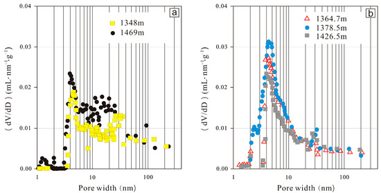 Scatter plot showing the pore widths of samples in YCYV1112 well [25]. (a) Pore widths of sandy laminated shale samples; (b) Pore widths of shale samples.