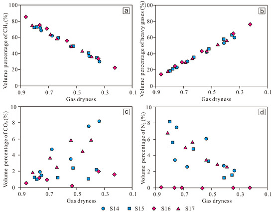 Scatter plot showing the migration ability of different gases. (a) Relationship between gas dryness and volume percentage of CH4; (b) Relationship between gas dryness and volume percentage of heavy gases; (c) Relationship between gas dryness and volume percentage of CO2; (d) Relationship between gas dryness and volume percentage of N2.