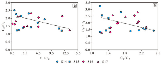Scatter plot showing the migration ability of heavy gases. (a) Relationship between C1/C2 and C2/C3; (b) Relationship between C2/C3 and C3/nC4.