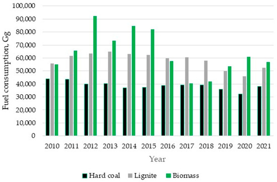 Hard coal and lignite are the basic fuels used in the power industry in Poland (Figure 1). However, biomass is also used as a solid fuel. Therefore, this is classified as a renewable resource, and CO2 emissions from biomass in the ETS system are considered to be zero, in accordance with the Commission Implementing Regulation (EU) 2022/388 of 8 March 2022 amending Implementing Regulation (EU) 2018/2066 on the monitoring and reporting of greenhouse gas emissions pursuant to Directive 2003/87/EC of the European Parliament and of the Council (Text with EEA relevance).