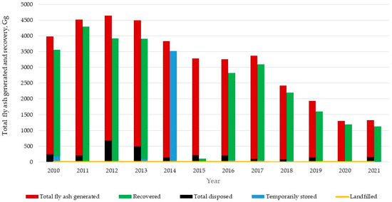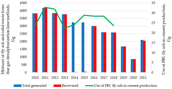 Analysis of fly ash data is difficult because of the change in its status from waste to by-product. The reported amount of waste produced has decreased every year, even though the number of ashes generated has remained at the same level (Figure 2). Recovery waste is waste used by the producer or transferred to other recipients for recovery processes (Figure 2). In 2010, 3980.1 Gg of fly ash was generated. By 2012, this amount had increased to more than 4500 Gg. After 2014, when 4489.1 Gg of fly ash was produced, the annual amount gradually declined until 2020, when just 1305.8 Gg of fly ash was generated, before rising again slightly in 2021 to a figure of 1324.3 Gg [10,11].