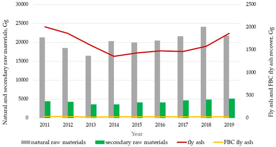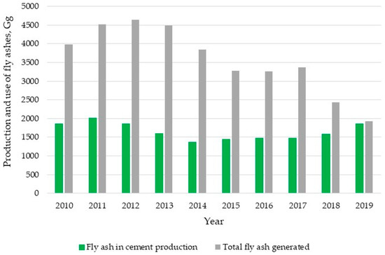 In the cement industry in Poland, fly ashes are used in the production of CEM II, CEM IV, and CEM V. In 2019, the Polish cement industry used 1,863,224.0 Mg of fly ash as an anthropogenic raw material, which represented approximately 96% of the fly ash produced (Figure 3) [12].