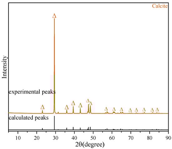 XRD pattern of calcite. Triangles is peaks of wave only, and no other meaning, experimental datas compared with calculated datas.
