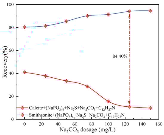 The effects of sodium carbonate on the flotation separation of smithsonite and calcite were investigated in the sulfuration-amine system using sodium hexametaphosphate as the depressant. Single mineral flotation tests consisted of three parts (Figure 3, Figure 4 and Figure 5), aimed at exploring the effects of pH, sodium hexametaphosphate, and sodium carbonate on the flotation of zinc and calcite. As shown in Figure 3, when the pH of the pulp was around 12.0, the maximum recovery of 85.60% for smithsonite was achieved, while the recovery of calcite decreased to the value of 69.25%. As displayed in Figure 4, with the increase of sodium hexametaphosphate dosage, the recovery of calcite rapidly decreased at the pH 12.0, indicating that sodium hexametaphosphate effectively depressed calcite, while the floatability of smithsonite deteriorated, and the recovery of calcite decreased to 42.58% at a sodium hexametaphosphate dosage of 10 mg/L. Further research was conducted on the effect of sodium carbonate on the flotation separation of smithsonite and calcite. As the dosage of sodium carbonate increased, the recovery of smithsonite reached 94.65%, while calcite was further depressed with a recovery of only 10.25%. In this case, a significant difference in floatability between smithsonite and calcite was achieved, and the final pH of the pulp was around 12.4. This indicated that a high concentration of sodium carbonate can effectively promote the flotation separation performance of smithsonite and calcite.