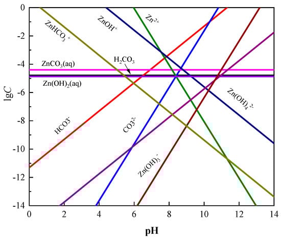 The dissolved components on the surface of smithsonite as a function of pH are shown in Figure 6. It can be seen that the Zn2+, ZnOH+, and ZnHCO3+ ions existed on the smithsonite surface at a pH around 8. When pH > 8, with the increase of pH, the contents of Zn2+ and ZnOH+ decreased continuously, while the contents of CO32−, Zn(OH)3−, and Zn(OH)42− increased gradually. When pH > 10, the surface of smithsonite mainly existed in the form of Zn(OH)3− and Zn(OH)42−, and with the increase of pH, CO32−, Zn(OH)3− and Zn(OH)42− increased [10,21].