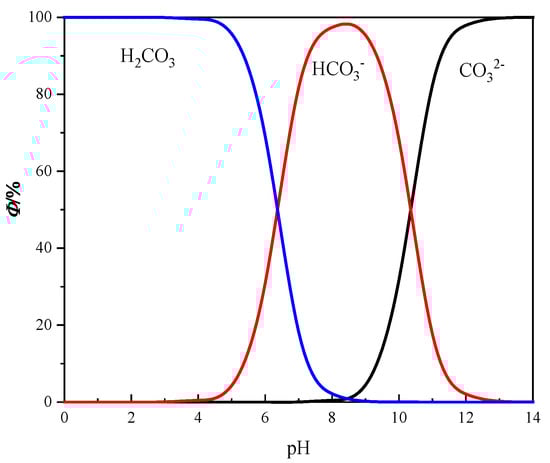 The component distribution of sodium carbonate as a function of pH with a concentration of 1.18 × 10−3 mol/L.