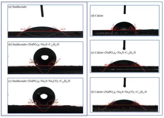 The contact angle of natural pure calcite powders was 81.2°, indicating that calcite presented superior natural hydrophobicity. With the pretreatment of sodium hexametaphosphate, sodium sulfide, and dodecylamine, the contact angle of calcite powders decreased to 46.6°, and with the further introduction of sodium carbonate, the contact angle of calcite powders decreased to 37.5°. It should be noted that adjusting the pH of the pulp with sodium sulfide and the addition of sodium hexametaphosphate had better depression effects on calcite powders. After the introduction of sodium carbonate, the contact angle of calcite was further reduced, which proved that sodium carbonate improved the hydrophilicity of calcite powders. Overall, all the results indicated that the addition of sodium carbonate improved the hydrophobicity of smithsonite and increased the hydrophilicity of calcite, resulting in a significant difference in the floatability of these two minerals, which was beneficial for their flotation separation. The results of the contact angle measurements were consistent with the flotation results of smithsonite and calcite.