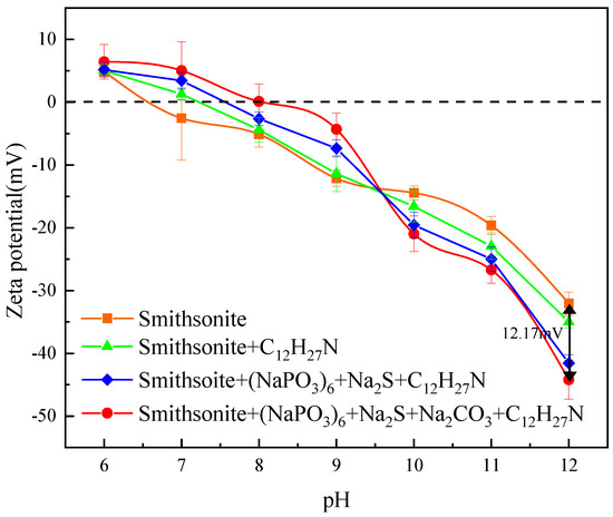 The effects of pH on the Zeta potential of the smithsonite surface before and after the addition of reagents are shown in Figure 9. The results show that the surface charge of smithsonite decreased with the increase of pH. The isoelectric point of smithsonite was about 6.5, which was consistent with the results in previous studies [24,25]. After the addition of dodecylamine, the isoelectric point of smithsonite shifted to the right by 0.5, indicating that dodecylamine molecules had adsorbed electrostatically on the surface of smithsonite. When the pH was 12.0, the zeta potential of smithsonite dropped sharply after the addition of sodium hexametaphosphate and sodium sulfide, which indicated that the interaction between dodecylamine and smithsonite powders can be enhanced with sodium sulfide. After the further introduction of sodium carbonate, the zeta potential of smithsonite powders decreased by 12.17 mV, compared to that only with dodecylamine. The above results demonstrated that the addition of sodium carbonate promoted the adsorption of dodecylamine on the surface of smithsonite.