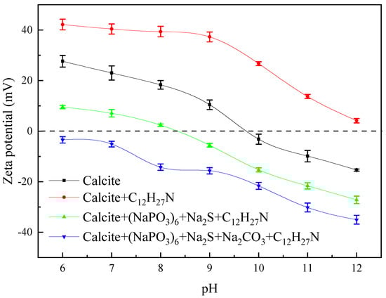 The effect of pH on the electrical properties of calcite powder is shown in Figure 10. It indicated that without any reagents, the zeta potential of calcite decreased with the increase of pH, and its isoelectric point was about 9.8, which was similar to the value in the literature [26]. After the addition of dodecylamine, the calcite potential increased and was always positively charged in the pH range of 6 to 12. After the addition of sodium hexametaphosphate, sodium sulfide, and dodecylamine, the zeta potential of calcite was reduced by about 16 mV compared with that of reagent-free condition, and its isoelectric point was shifted to the left by 1.6. This was because after adjusting the pulp with sodium sulfide, sodium hexametaphosphate was tightly adsorbed on the calcite surface in the form of electrostatic adsorption or chelation with calcium ions, which was not conducive to the interaction between dodecylamine and calcite, so the flotation of calcite particles was depressed [27,28]. After the further addition of sodium carbonate, the zeta potential of calcite continued to decrease and was negative in the pH range of 6 to 12. This indicated that the introduction of sodium carbonate resulted in the adsorption of excess free carbonate ions on the calcite surface. The complexes formed on the surface of calcite prevented the adsorption of amine molecules. In addition, after the introduction of sodium carbonate, the pH of the pulp was further increased. In this case, the amine molecules in the solution were the dominant components, and the amine molecules cannot form complexes with the Ca2+ on the surface of the calcite due to the chelation with calcium ions by excess free carbonate ions from sodium carbonate [29].