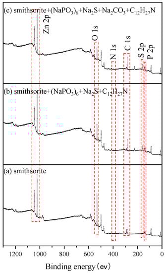 The XPS measurements were conducted with a 250 XI X-ray photoelectron spectrometer from ThermoFisher Scientific, USA. The Al Kα radiation source (hν = 1486.6 eV) was used, the vacuum degree was around 5.0 × 10−9 mbar, and the scanning range was 1400 eV~0 eV. Smithsonite pretreated with DI water; smithsonite pre-treated with sodium hexametaphosphate, sodium sulfide, and dodecylamine; smithsonite pretreated with sodium hexametaphosphate, sodium sulfide, sodium carbonate, and dodecylamine; calcite pre-treated with DI water; calcite pre-treated with sodium hexametaphosphate, sodium sulfide and dodecylamine; and calcite pretreated with sodium hexametaphosphate, sodium sulfide, sodium carbonate, and dodecylamine were all used as samples for XPS analysis. The C1s peak at 284.6 eV was employed to correct binding energies. The obtained spectra were fitted and plotted using XPS Peak 4.1 software.
