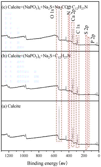 Meanwhile, C, O, Ca, and P elements on the natural calcite surface were examined. Some impurities appeared on the surface of the calcite, possibly due to sample preparation and contamination by carbon dioxide in the air, but there was no effect on the analysis of the elements in general. After pretreatment of sodium sulfide and sodium hexametaphosphate, the contents of C, Ca, and P changed by 3.90%, 0.81%, and 1.38%, respectively, while the content of O increased by 2.47%, as shown in Table 2, indicating that after adjusting the pH of the pulp with sodium sulfide, sodium hexametaphosphate was more easily adsorbed on the surface of calcite [28]. After the introduction of sodium carbonate further, it can be seen that the contents of C, Ca, and P on the surface of calcite changed by 0.44%, 0.40%, and 0.23%, respectively, indicating that the addition of sodium carbonate enhanced the adsorption of sodium hexametaphosphate on the surface of calcite, resulting in a decrease in the adsorption of dodecylamine on the surface of calcite, which was consistent with the flotation results of calcite.