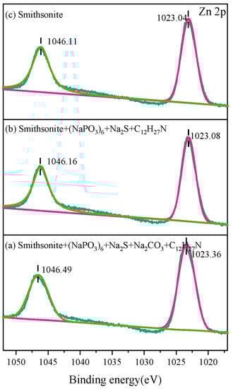 To further identify the surface differences of samples, the fitting of Zn 2p and Ca 2p peaks was conducted. The fitting Zn 2p peaks of smithsonite samples are shown in Figure 13. Zn 2p 3/2 and Zn 2p 1/2 are two spin-orbit splitting peaks with binding energies of 1023.36 eV and 1046.49 eV, respectively [32,33]. On the surface of smithsonite pretreated with sodium sulfide, sodium hexametaphosphate, and dodecylamine, as shown in Figure 13b, the binding energies of Zn 2p 3/2 and Zn 2p 1/2 were about 1023.08 eV and 1046.16 eV, respectively, corresponding to zinc-sulfur compounds and zinc hydroxide [34,35]. After the further addition of sodium carbonate, compared with Figure 13b, the binding energies of Zn 2p 3/2 and Zn 2p 1/2 were shifted by 0.04 eV and 0.05 eV, respectively. It indicated that the introduction of carbonate increased the active sites on the surface of smithsonite, which was beneficial to the adsorption of dodecylamine on the smithsonite surface [36,37].
