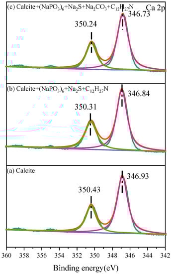 The fitting Ca 2p peaks of calcite samples are shown in Figure 14. The XPS spectrum of Ca 2p on the calcite surface includes two spin-orbit splitting peaks, Ca 2p 3/2 and Ca 2p 1/2, with the binding energies of 346.93 eV and 350.43 eV, respectively [38,39]. After pretreatment with sodium sulfide, sodium hexametaphosphate, and dodecylamine, as shown in Figure 14b, the binding energies of Ca 2p 3/2 and Ca 2p 1/2 on the calcite surface decreased by 0.09 eV and 0.12 eV, respectively. After further introduction of sodium carbonate, as shown in Figure 14c, the binding energies of Ca 2p 3/2 and Ca 2p 1/2 on the calcite surface decreased by 0.20 eV and 0.19 eV, respectively. The significant changes in the Ca 2p binding energy suggested that the addition of sodium hexametaphosphate largely altered the chemical environment of the surface elements of calcite. This may be due to the fact that the surface of calcite adsorbed more sodium hexametaphosphate, hindering the adsorption of dodecylamine and resulting in a significant decrease in the recovery rate of calcite. Additionally, it can be demonstrated that sodium hexametaphosphate may adsorb onto the surface of calcite through chelation with calcium ions. After introducing saturated sodium carbonate, the pH of the pulp further increased, making dodecylamine molecules the dominant component. However, unlike with the zinc ions on the surface of the smithsonite, dodecylamine molecules could not form metal chelate complexes with the calcium ions on the surface of calcite, further promoting the inhibitory effect of sodium hexametaphosphate on calcite.