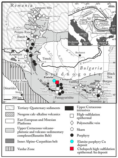 The Elatsite–Chelopech ore field is situated in the Panagyurishte District of the Central Srednogorie Zone, Bulgaria. The Srednogorie Zone is part of the Apuseni–Banat–Timok–Srednogorie Arc [20,21] (Figure 1); a belt of mafic to dacitic calc-alkaline magmatism related to the subduction of Mesozoic oceanic crust under southeastern Europe from the Albian to the Maastrichtian [22]. The Panagyurishte District is a NNW–SSE trending alignment of ore deposits oblique to the general strike of Central Srednogorie Zone. It includes porphyry Cu deposits (Vlaykov Vruh, Tsar Assen, Medet, Assarel, and Elatsite), and high-intermediate sulfidation epithermal deposits (Elshitsa, Radka, Krassen and Chelopech) (Figure 1).