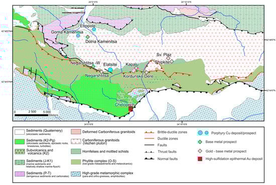 Geological map of the region with the location of the ore deposits and prospects (modified after Antonov et al. [29], Kounov et al. [30] and reference therein).