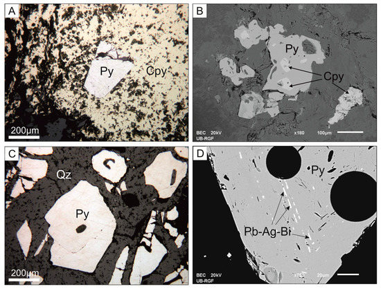 Mineralization stages in the other two porphyry Cu prospects (Etropole and Gorna Kamenitsa) show some of the features similar to the Elatsite deposit (summarized in Table 1). It is unclear if the simpler apparent paragenesis at these prospects is a real feature or a function of the poorer exposure and availability of materials. The samples analyzed from these locations also correspond to the pyrite–chalcopyrite stage and quartz–pyrite–(sericite) stage veins. In our samples from all three porphyry localities, the pyrite–chalcopyrite stage veins consist mostly of chalcopyrite and pyrite (Figure 3A), with inclusions of tetrahedrite in chalcopyrite. Pyrite and chalcopyrite are also disseminated in the host rocks (Figure 3B). The quartz–pyrite–(sericite) veins consist mostly of quartz and pyrite (Figure 3C) in association with sericite wallrock alteration. Exceptions to this are the sample El1360W from the western margin of the Elatsite deposit, which includes both chalcopyrite and sphalerite, as well as unidentified Pb-Ag-Bi-bearing inclusions in pyrite that were detected by SEM (Figure 3D).