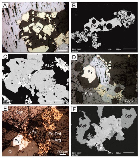 Photomicrographs of samples from base metal prospects, showing relationships between observed minerals: (A) Subhedral to euhedral pyrite crystals and later galena (H-C1_183.9). (B) Pyrite with massive core and sieve-textured rims (H-C 1_21). (C) Pyrite with irregular zoning in association with arsenopyrite (DK12-1). (D) Sphalerite, galena, chalcopyrite and freibergite from the base metal stage around earlier-formed pyrite grain (H-C 1_183.9). (E) Pyrite grains are cracked. Chalcopyrite, sphalerite, galena, pyrargyrite and argentite in the cracks. Later carbonates (DK12-1). (F) Irregular zoning of freibergite (H-C 1_177.8). Abbreviations: Py—pyrite; Aspy—arsenopyrite; Cpy—chalcopyrite; Gal—galena; Sph—sphalerite; Fr—freibergite; Pyr—pyrargyrite; Arg—argentite; Qz—quartz.