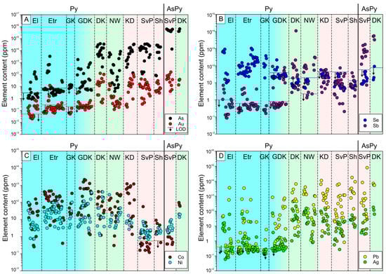 Element content in pyrite from all studied deposit/prospects and arsenopyrite where present obtained by LA-ICP-MS analyses. Deposit/prospects are sorted according to their mineralization type—cyan color for porphyry copper; green for base metal; pinkish for gold-base metal. Abbreviations: El—Elatsite; Etr—Etropole; GK—Gorna Kamenitsa; GDK—Gorna-Dolna Kamenitsa; DK—Dolna Kamenitsa; NW—Negarshtitsa-West; KD—Kordunsko Dere; SvP—Svishti Plaz; Sh—Shipkite.