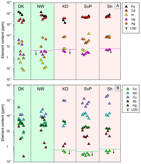 The maximum measured FeS content in sphalerite from both prospects is 3.48 mol%. Cadmium content reaches up to 7500 ppm, Cu—up to 360 ppm, Ag—up to 67 ppm, Mn—up to 182 ppm, Co—up to 34 ppm and Hg—up to 53.5 ppm. Germanium and In contents are relatively low (Figure 7).