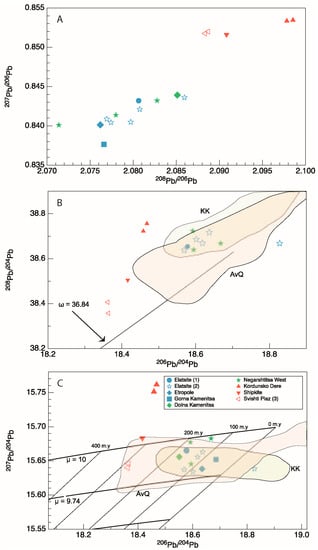 Lead isotope data of sulfides from the Elatsite–Chelopech ore-field (A–C) compared with published lead isotope whole-rock data for Central Srednogorie/Panagyurishte district (B,C). (A) 208Pb/206Pb vs.207Pb/206Pb plot, (B) 208Pb/204Pb vs. 206Pb/204Pb plot and (C) 207Pb/204Pb vs. 206Pb/204Pb plot. The evolutionary Pb-Pb curves for the different µ and ω values are calculated after Stacey and Kramers [57]. The “KK” and “AvQ” fields consist of whole-rock Pb-isotope for Late Cretaceous and Variscan magmatic rocks of the Panaguyrishte district after Kouzmanov et al. [2], and von Quadt et al. [37,38], respectively. All whole-rock samples are not age-corrected. Sulfide lead isotope data from Elatsite (1) are after Amov et al. [19], Elatsite (2) after von Quadt et al. [37], and Svishti Plaz (3) after Amov [58].