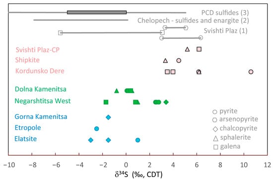 Variations of δ34S (‰) vs. CDT (Canyon Diablo Troilite) in sulfides from deposits and prospects in the northern part of Elatsite–Chelopech ore field, Bulgaria. For comparison, published sulfur isotope data for the same region of study are shown: (1) Вogdanov and Zairi [59]; (2) Moritz et al. [60]; and the main field of porphyry copper deposits (PCD; black line with the dark grey rectangle of most common variations from 0 to −5 δ34S‰; (3) Hofstra and Cline ([17] and references therein).