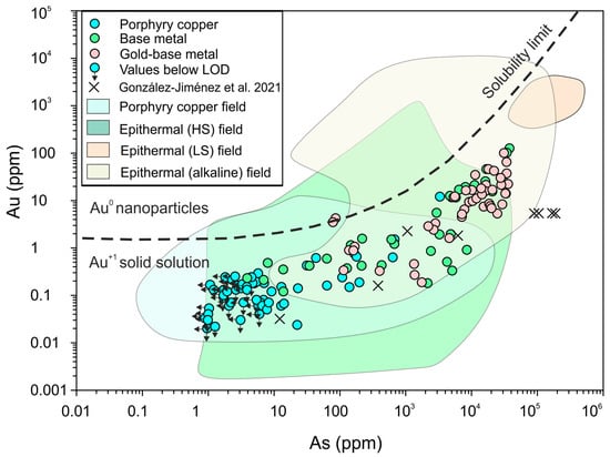 The pyrite samples from the base metal veins show higher As content and elevated Au content than those from the porphyry copper deposit/prospects. Comparable elevated As content in pyrite from the Elatsite deposit is reported by Krumov and Bogdanov [62] and Gonzalez-Gemenez et al. [55] from epithermal pyrite–galena–sphalerite association. The Au content in the pyrite from the base metal veins is highly variable and shows a positive correlation with As content. A similar positive Au/As correlation in pyrite has already been reported for Au-bearing arsenian pyrite from other hydrothermal deposits worldwide [6,14,15,63,64]. This correlation reflects the impact of arsenic in the speciation of Au in pyrite, i.e., incorporation either into the lattice as a solid solution or as micro- to nano-sized inclusions of Au-bearing minerals (Figure 10 after Reich et al. [64]; Keith et al. [14] and reference therein). According to Reich et al. [64], results plotting below the solubility curve should contain gold in solid solution, whereas those plotting above the solubility line should have Au as solid inclusions. All our data points from the three types of mineralization plots are below the solubility curve on the diagram, inferring that gold is present within the crystal lattice of the studied pyrite samples. Our results are concordant with the previously published data from porphyry Cu and epithermal Au deposits (Figure 10).