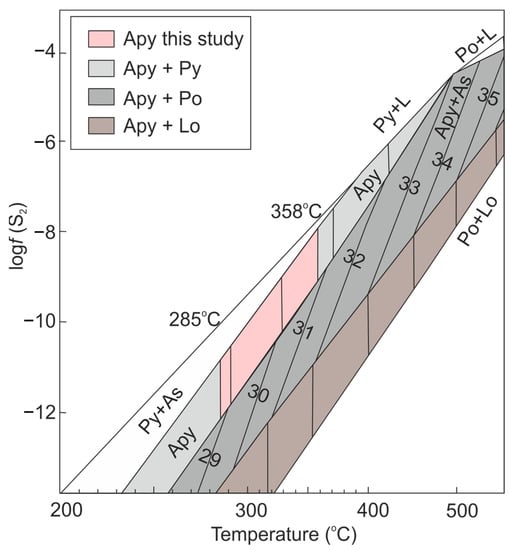 Activity of log f(S2) and temperature projection of the stability field of arsenopyrite from the Svishti Plaz gold-base metal veins after Kretschmar and Scott [68] and Sharp et al. [69].