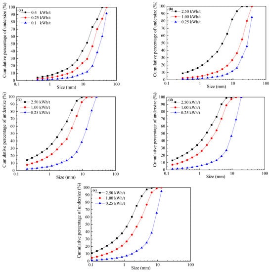 3.3.1. Analysis Results of the Particle Size Composition of Impact Crushing Products Obtained by the SMC Drop Weight Test